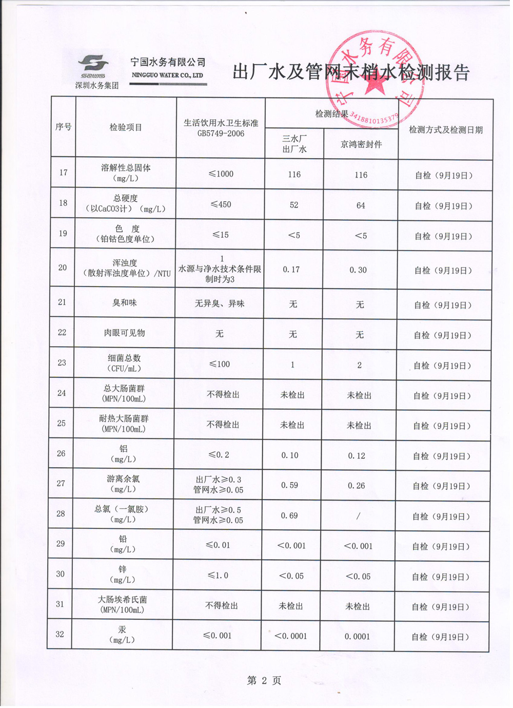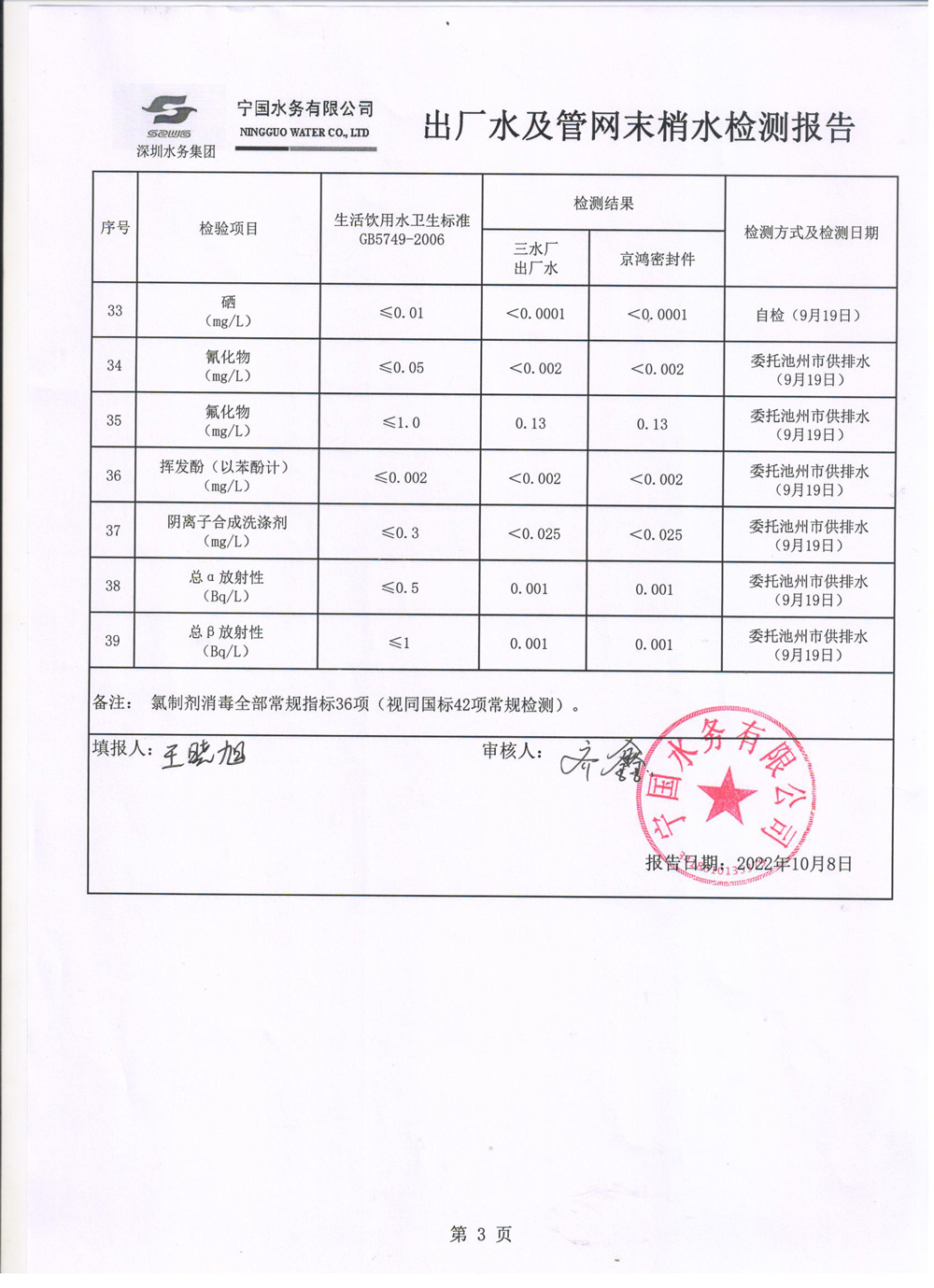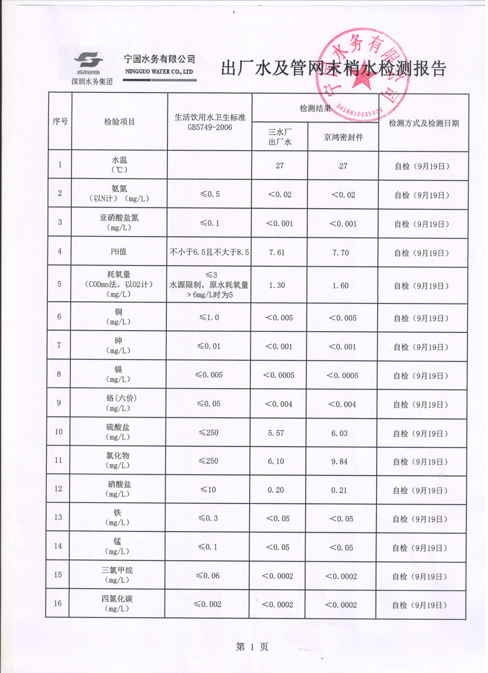 2022年9月份水質(zhì)報(bào)告