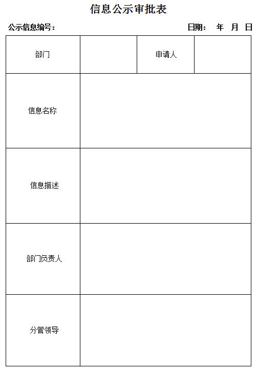 所有公示信息的內(nèi)容由各業(yè)務(wù)部門自行編制,并確定公示信息的發(fā)布形式和時(shí)間,經(jīng)各部門主管領(lǐng)導(dǎo)審批通過后方可公示,流程如下: