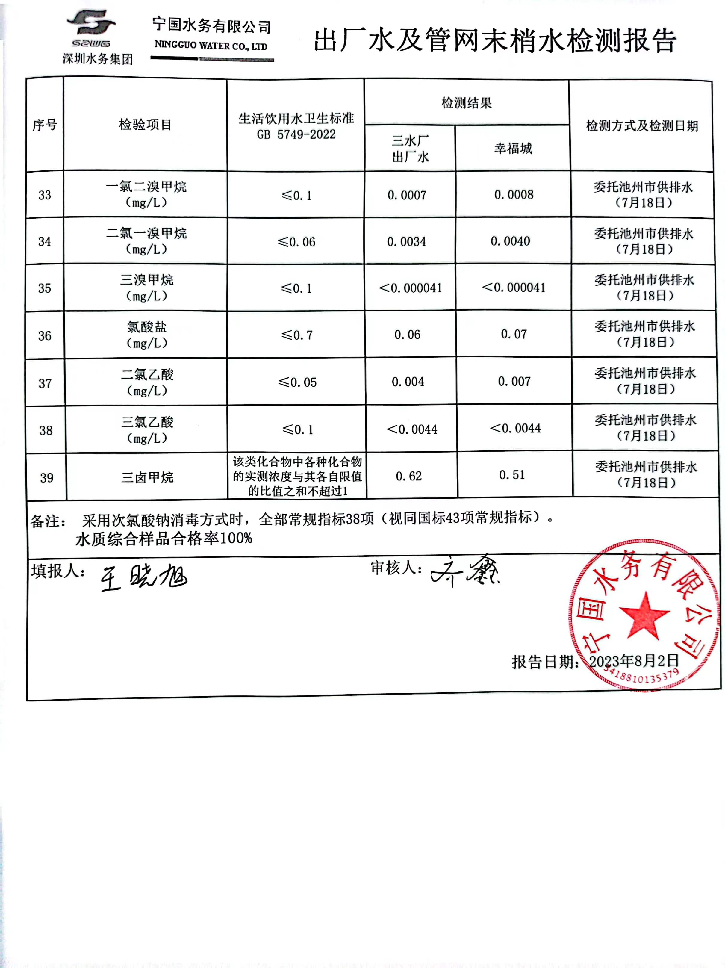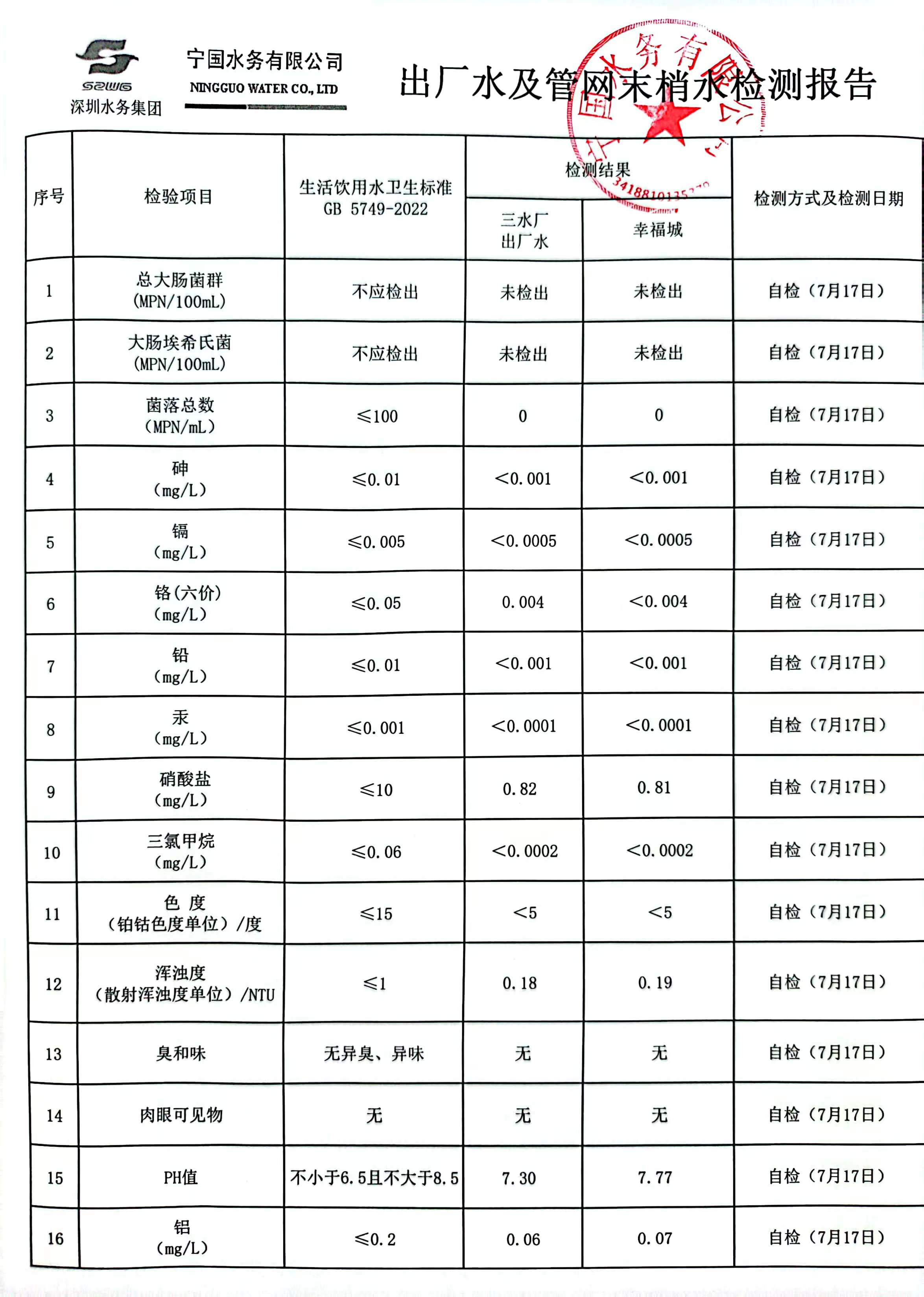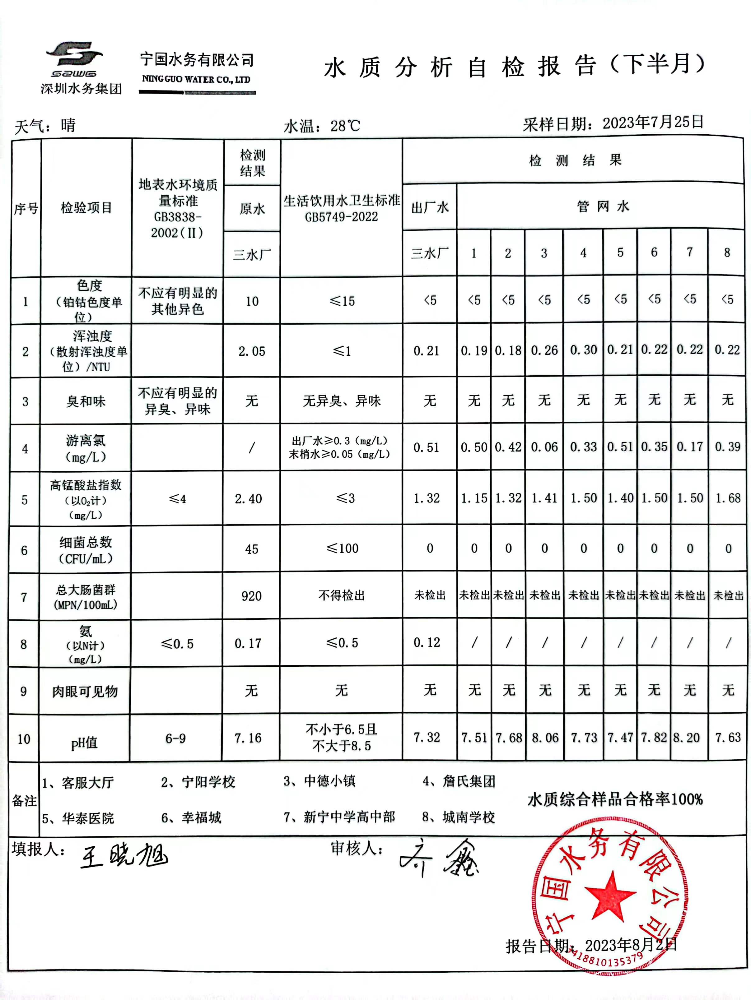 2023年7月份水質(zhì)報告
