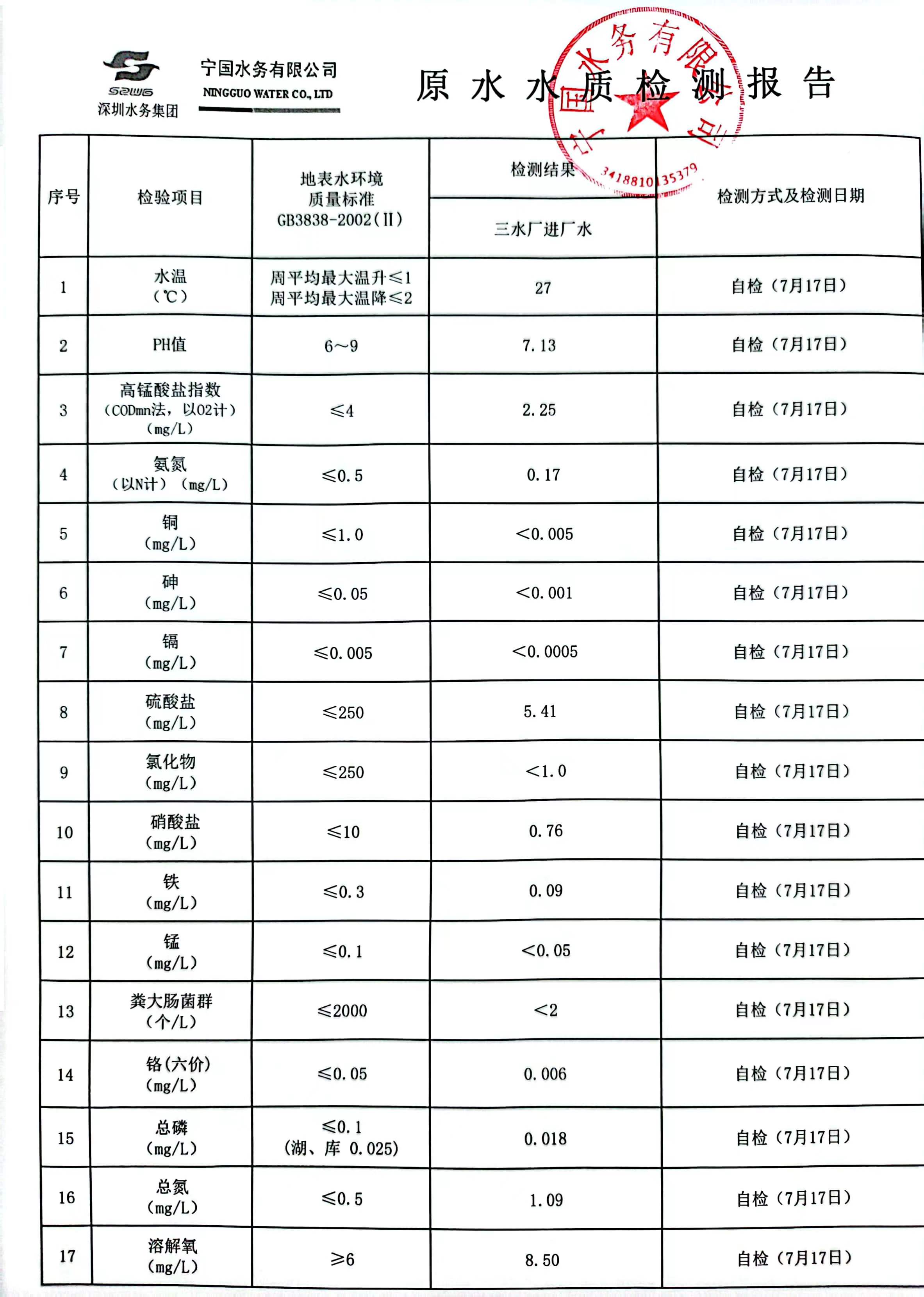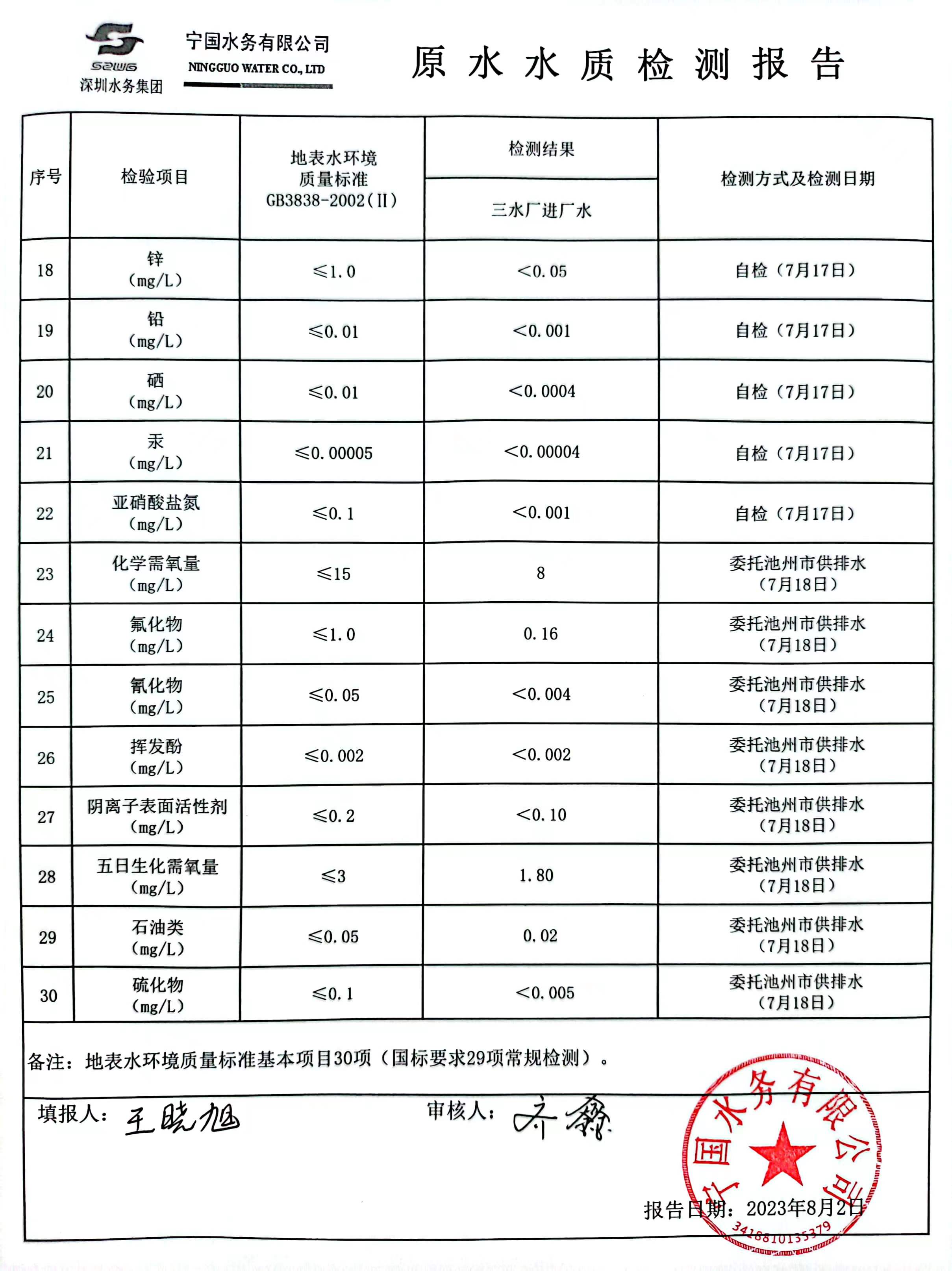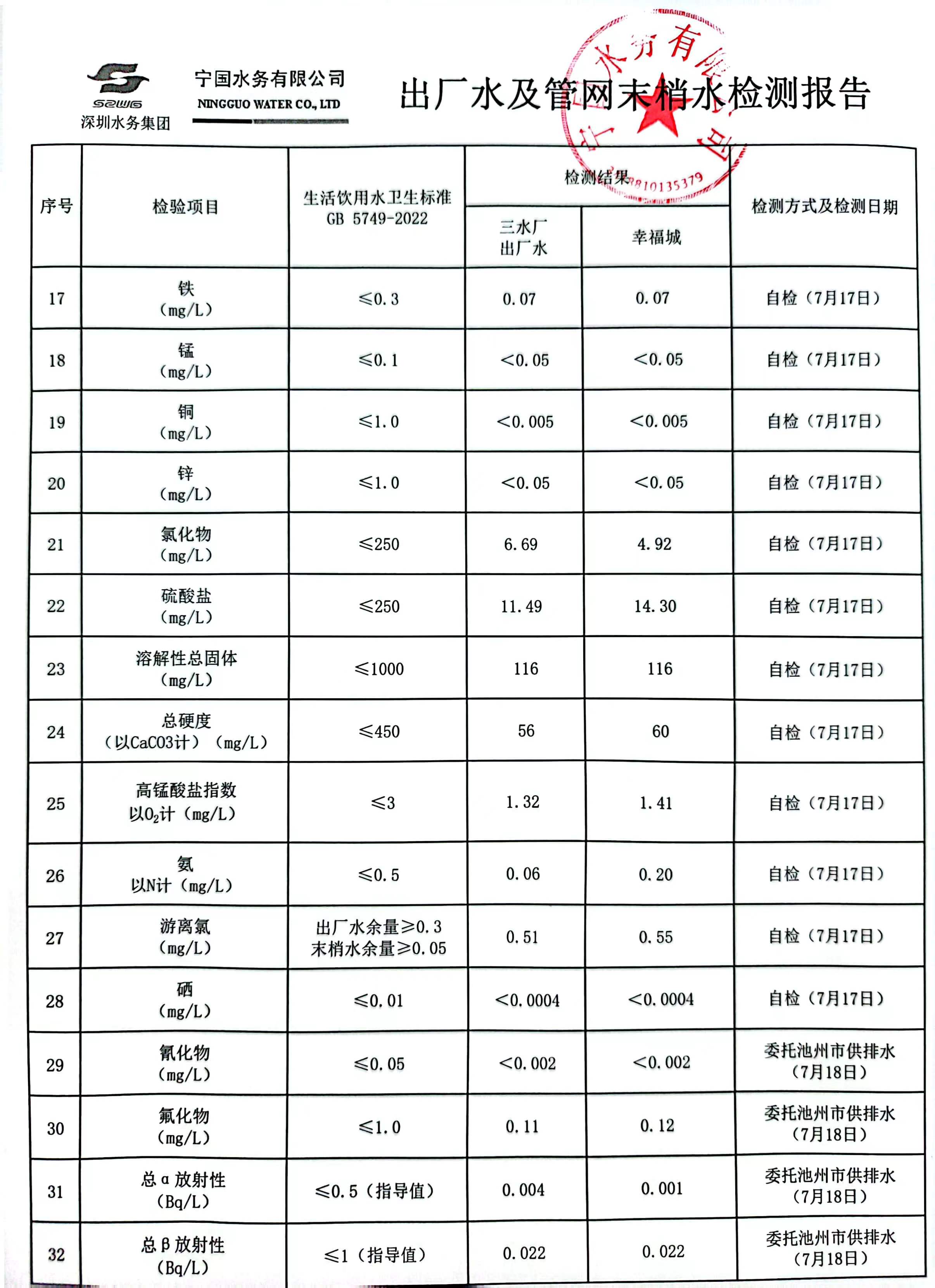 2023年7月份水質(zhì)報告