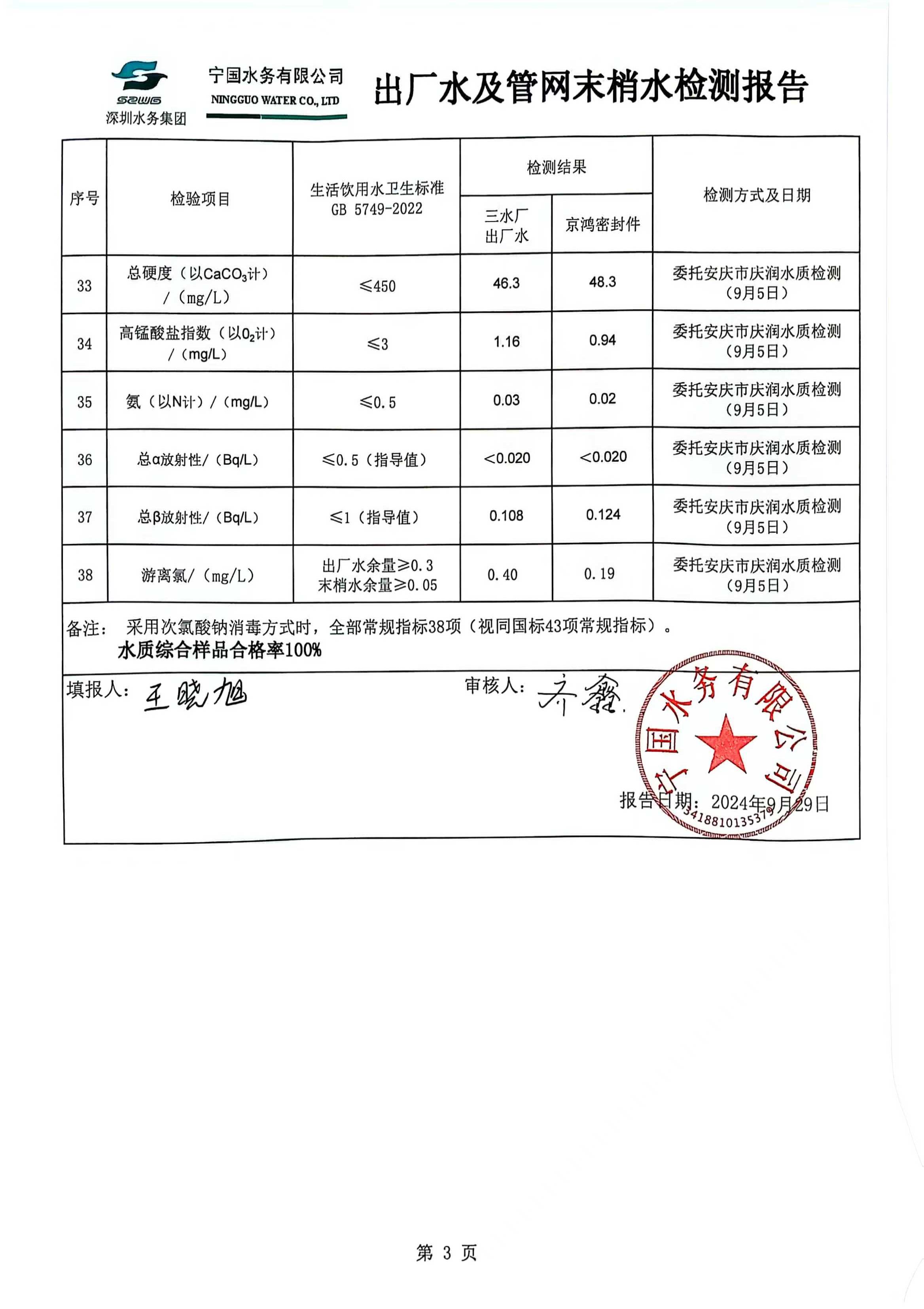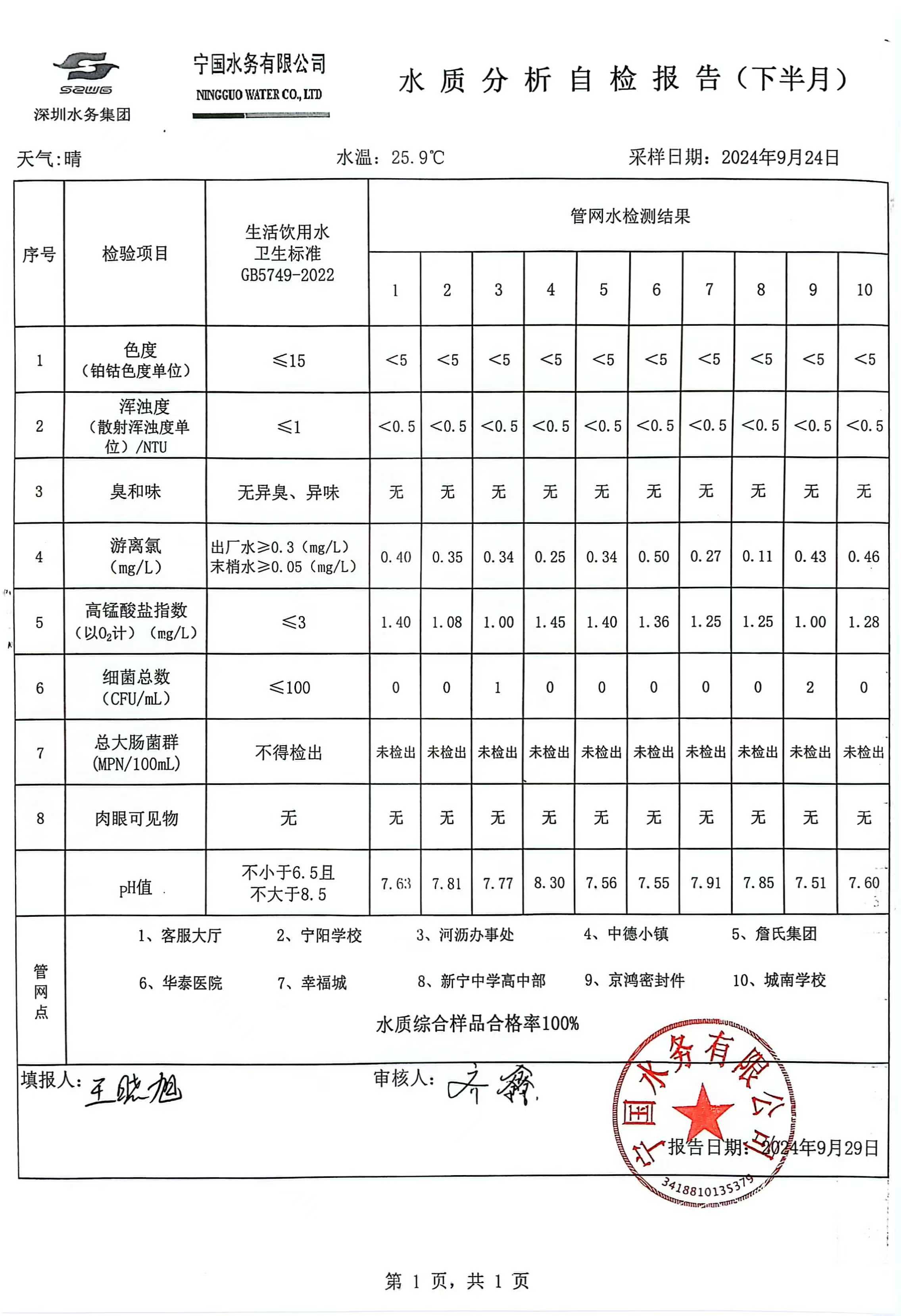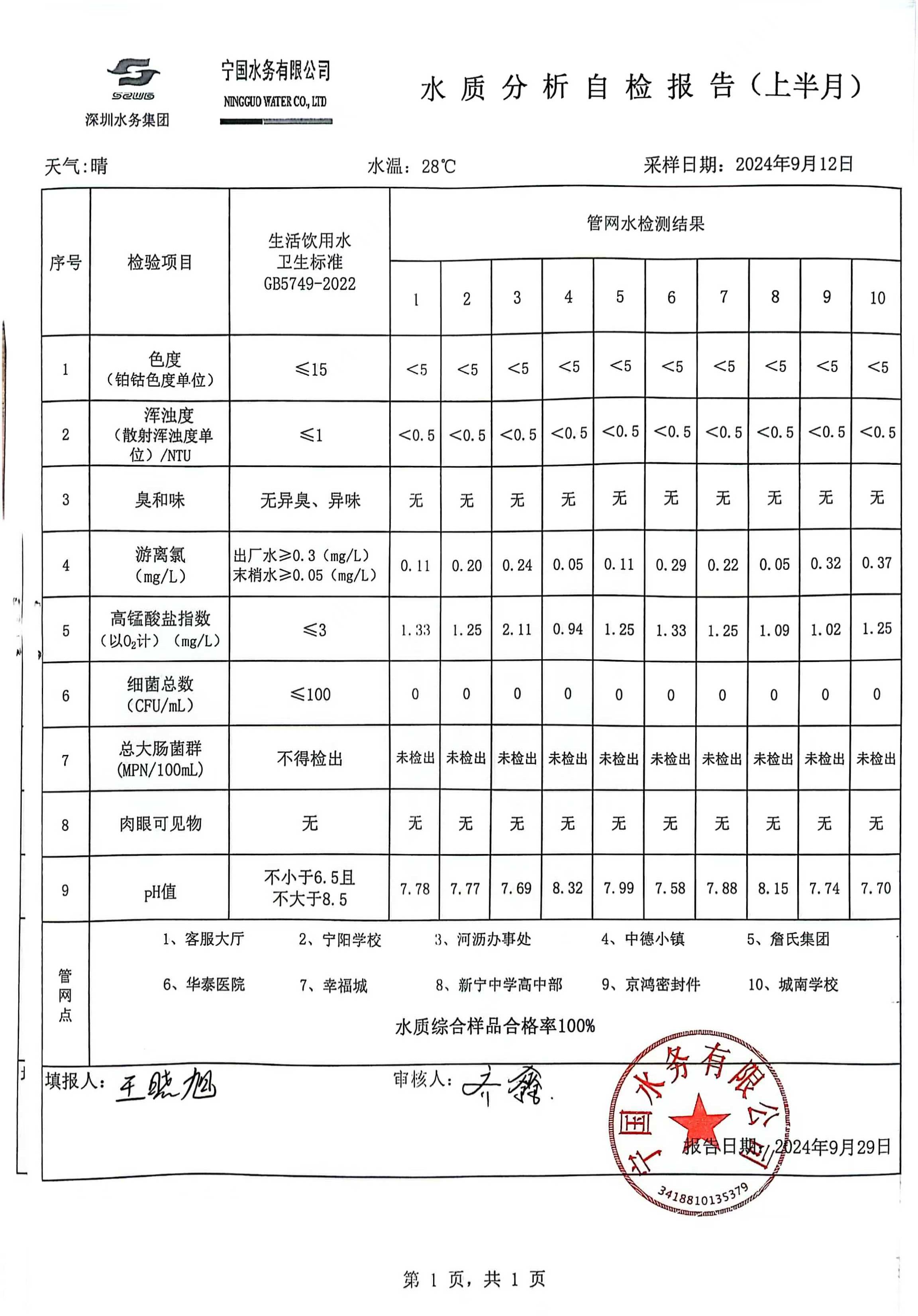 2024年9月份水質(zhì)報(bào)告